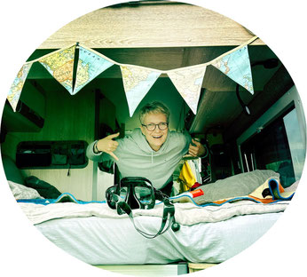 Er ist 6 Meter lang und hat eine Toilette, eine Dusche, ein großes Bett, einen Gasherd, einen Kühlschrank, jede Menge Schränke und einen großen Kofferraum. Wir können autark stehen, haben nämlich drei Solarpanele auf dem Dach.