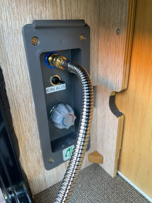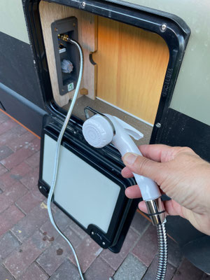 Das Trennklo braucht kein Wasser. Also ist ein Wasseranschluss in der Seitenklappe über. Da ist jetzt eine Warmwasser-Dusche.