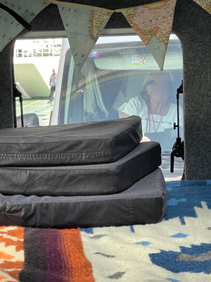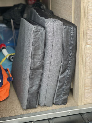 Sie sollten eigentlich auch noch als zusätzliche Sitzpolster dienen. Draußen oder so. Brauchen wir aber irgendwie nie.