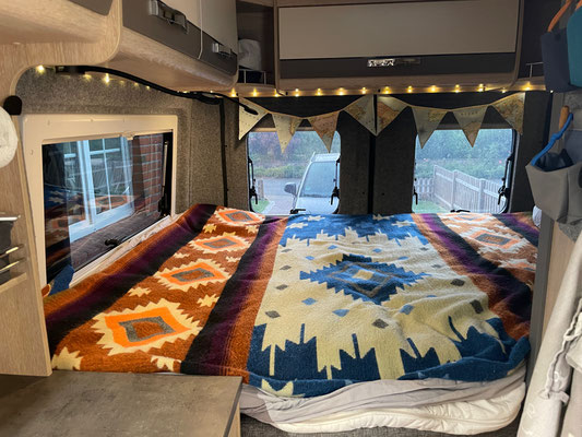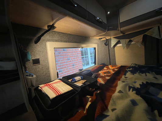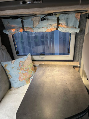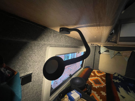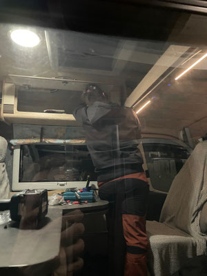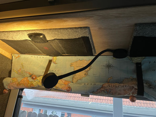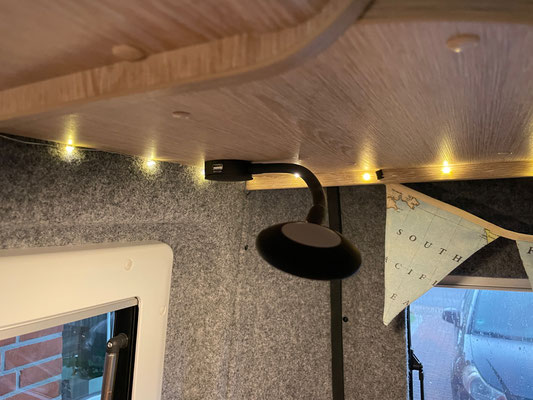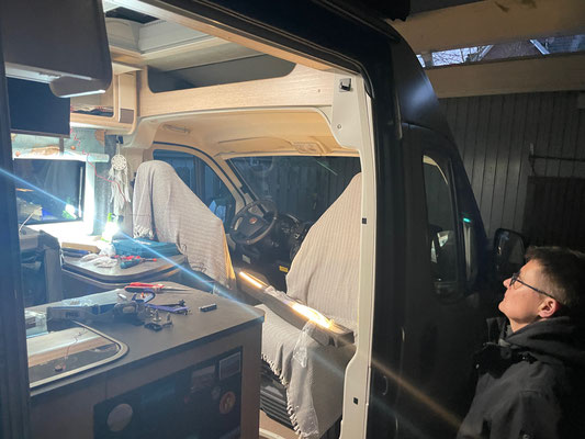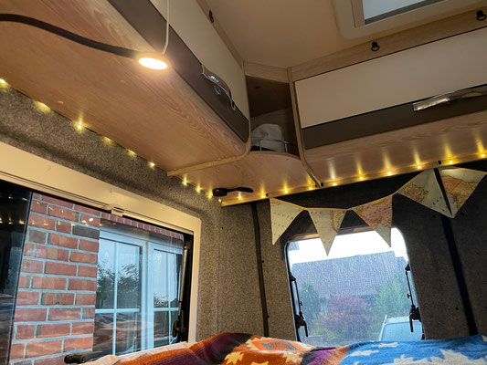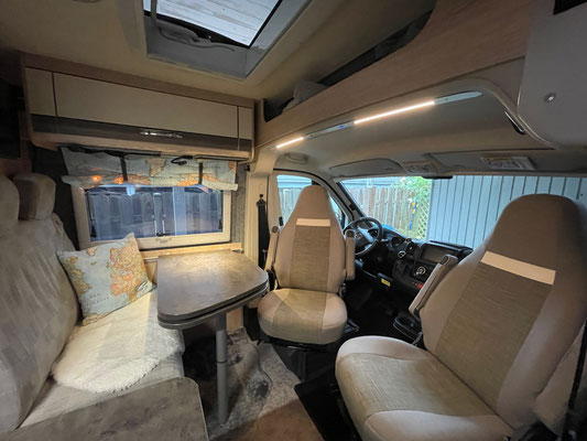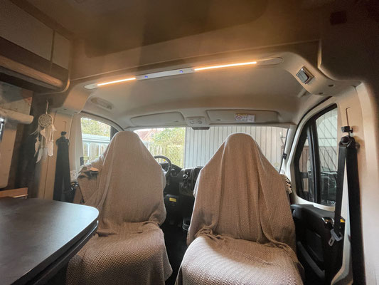 Die beiden umgedrehten Sitze haben ja ab Werk gar keine Leselampe. Deswegen haben wir diese Lichtleiste, die in die längliche Vertiefung im Fahrerhaus passt, gekauft. Das Licht ist klasse, kann auch gedämmt werden.