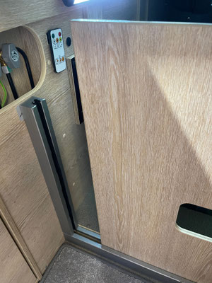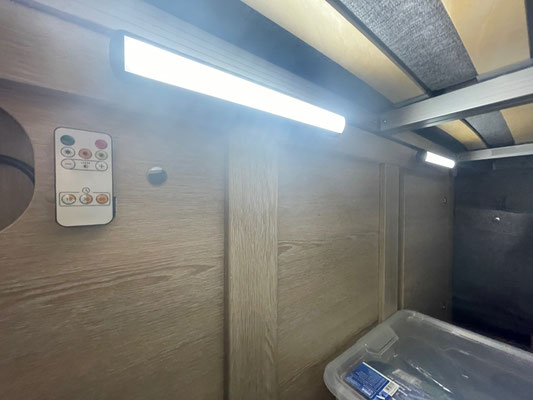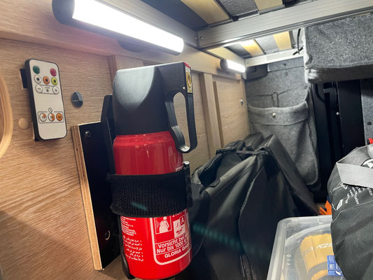 Jetzt haben wir zwei Lampen mit Magnet befestigt und können sie per USB laden, mussten wir aber noch nie. Man hat sie ja selten und meist nur kurz an. Die beiden Fernbedienungen haben wir mit Klett befestigt, eine von den Hecktüren aus bedienbar und die andere vom Wohnraum aus. Jetzt haben wir also auch in der Heckgarage endlich Durchblick.
