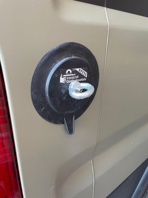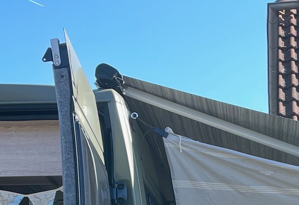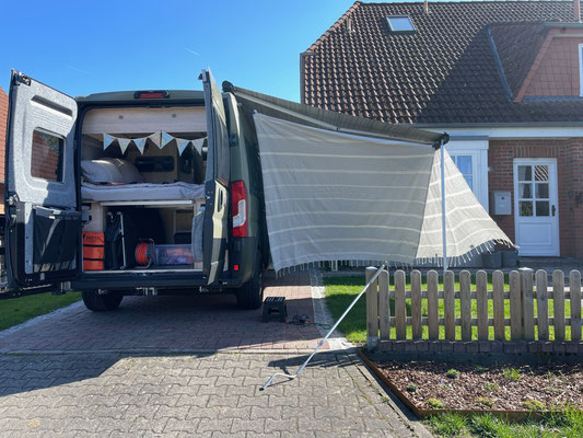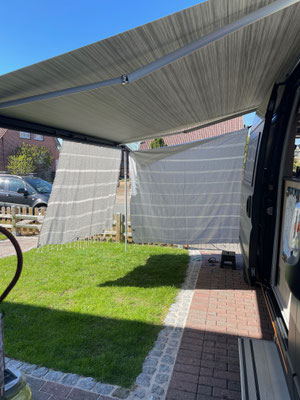 Dann haben wir Ringe in die Tücher gestanzt, so dass wir sie mit Gummibändern an den Magneten am Wohnmobil und an den Stangen der Markise und am Boden mit Heringen fixieren können. Für unsere