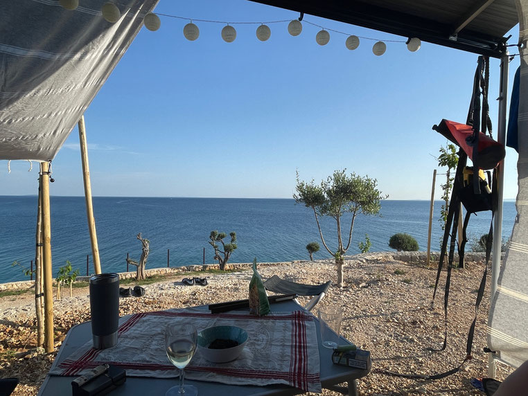 Wie man sieht, haben wir die Tücher in Kroatien auch an einen Pfahl vom Baum gebunden. Leider haben sie ein bisschen Hochwasser. Ich muss irgendwann nochmal neue etwas längere nähen, glaube ich.