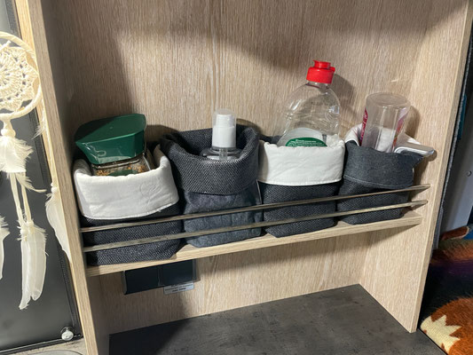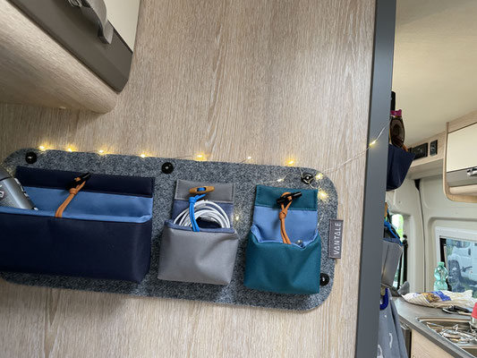 Die Filzplatten sind mit Klebeschrauben befestigt. Die Fächer sind echt gut für alles, was immer auf dem Tisch rumliegt (Sonnenbrille, Portemonnaie, Handy, Lesebrille) und unten bei den Steckdosen können die Dinge, die geladen werden, in die Netze, nämlich der Minidrucker Sprocket, die Handys, die Powerbank und solche Geräte.