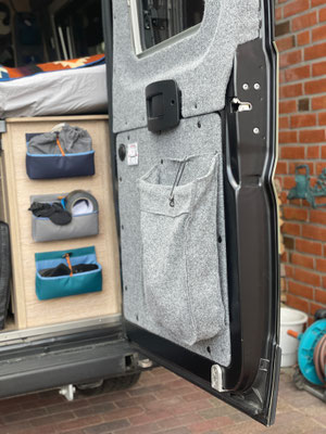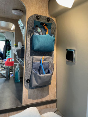 Die Taschen sind mit Druckknöpfen an den Filzplatten befestigt. Die Filzplatten sind mit Klebeschrauben an den Wänden befestigt, die man rückstandslos wieder entfernen kann.
