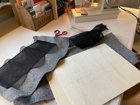Das elastische Netz hat Tatti als Meterware bestellt. Ich habe es zugeschnitten und auf die Filzreste genäht und das Ganze dann stramm über das Brett gespannt.