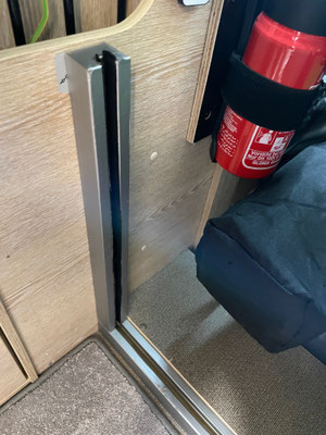 Irgendwann hat Tatti eine Schiebetür aus der Trennwand gemacht, was gar nicht so schwer war. Den Holzblock, der als Trittstufe in der Öffnung hing, lassen wir weg und nutzen anstattdessen einen