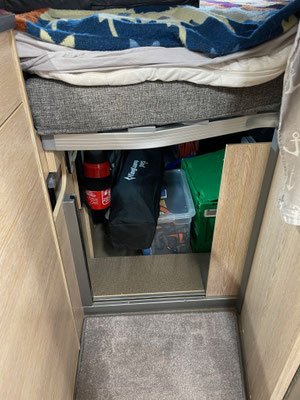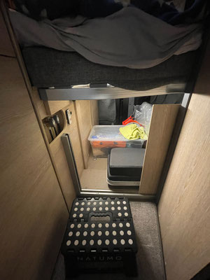 Klapptritt. Das ist viel komfortabler zum Ein- und Aussteigen ins bzw. aus dem Bett. Und der Klapptritt dient zwischendurch auch als schneller Sitz draußen oder als Tischchen für den